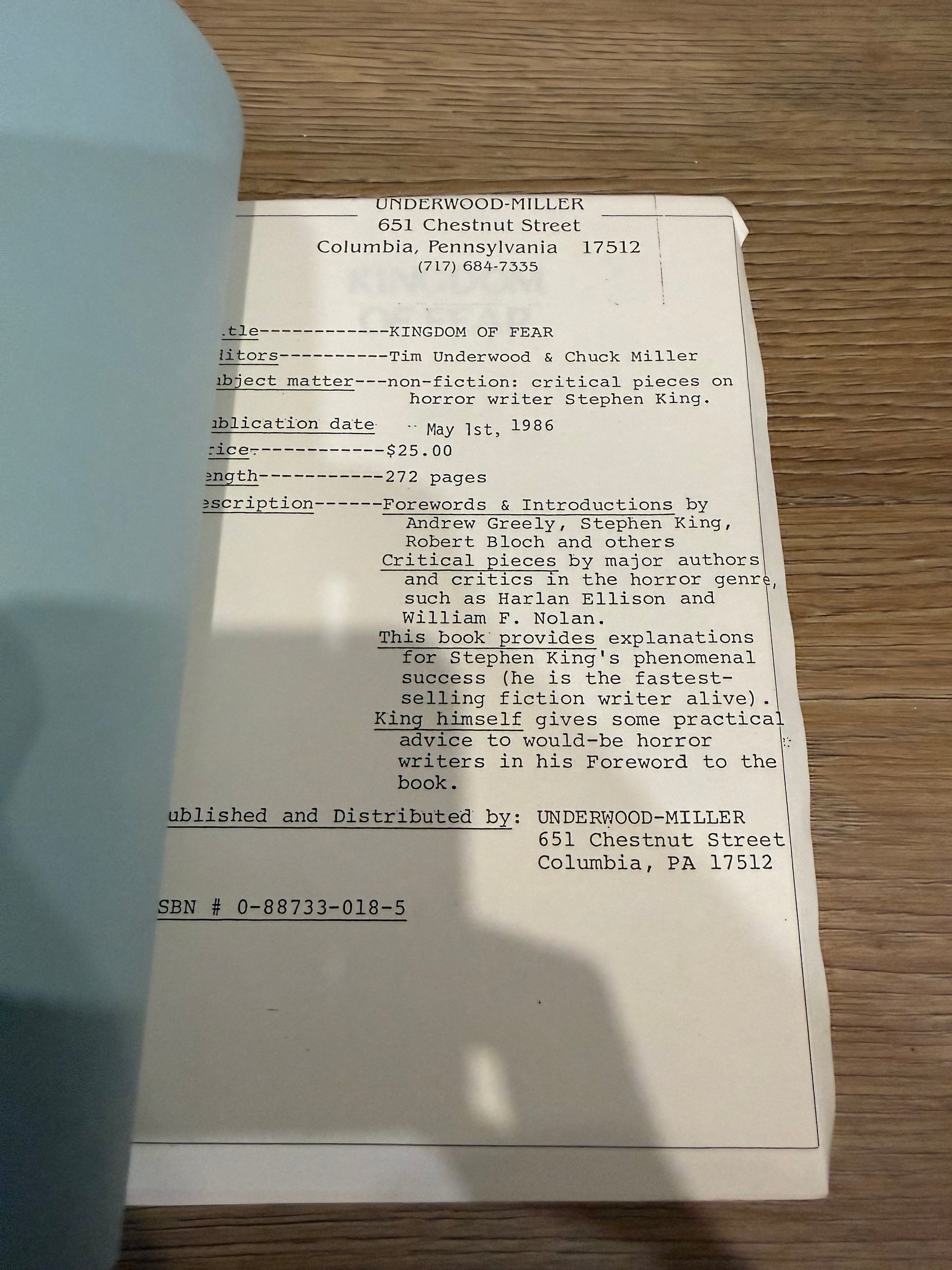 Kingdom of Fear, First Edition and Uncorrected Proof, Underwood Miller